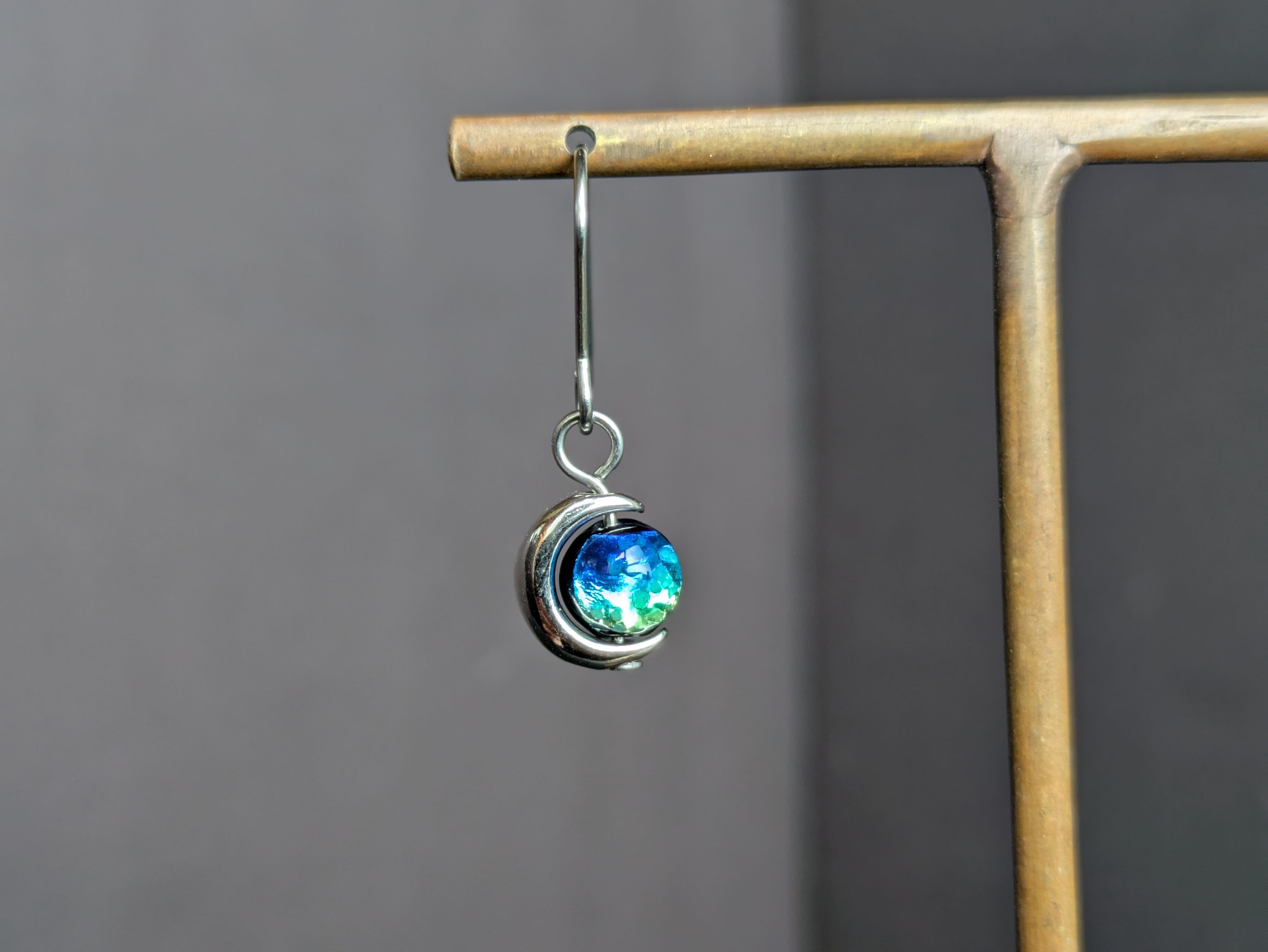このガラスピアスは、職人の手によって丁寧に作られ、銀箔が施されたことで、光を受けるたびに美しい煌めきを演出します。神秘的な魅力を兼ね備えたこのアイテムは、あなたの個性を引き立てる存在になることでしょう。